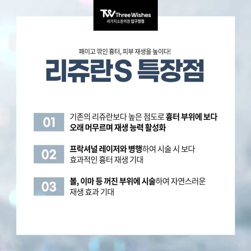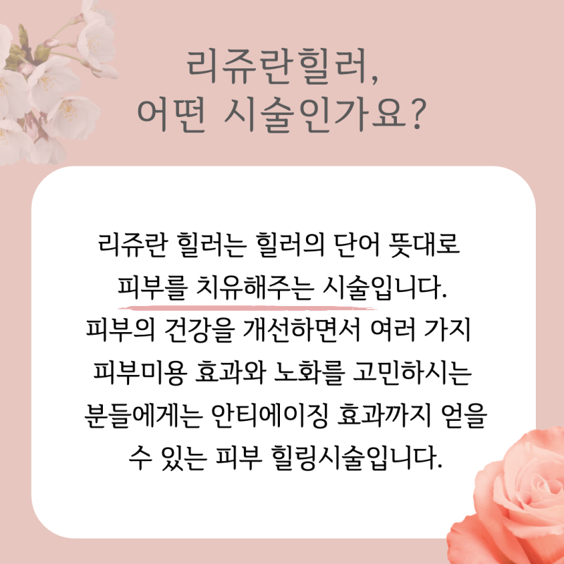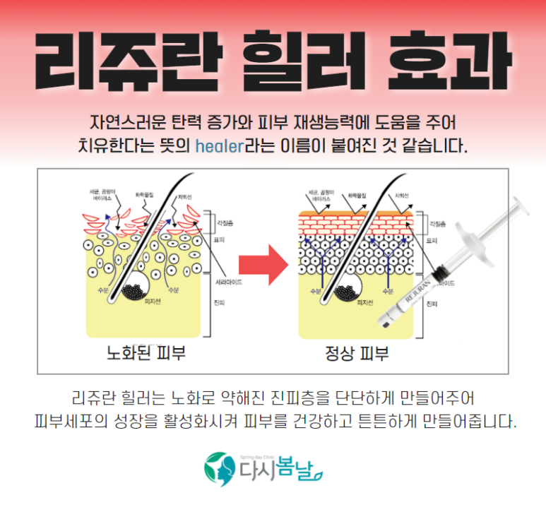 리쥬란힐러는 연어에서 추출한 재생특화성분 폴리뉴클레오티드(PN)를 피부 진피층에 직접 주사함으로써 재생능력을 활성화시키고 피부 재부상 조건을 개선하여 탄력, 주름, 수분 등을 해결하는 시술입니다.강서동쥬란 마곡리쥬란효과가격엠보 / 내부
