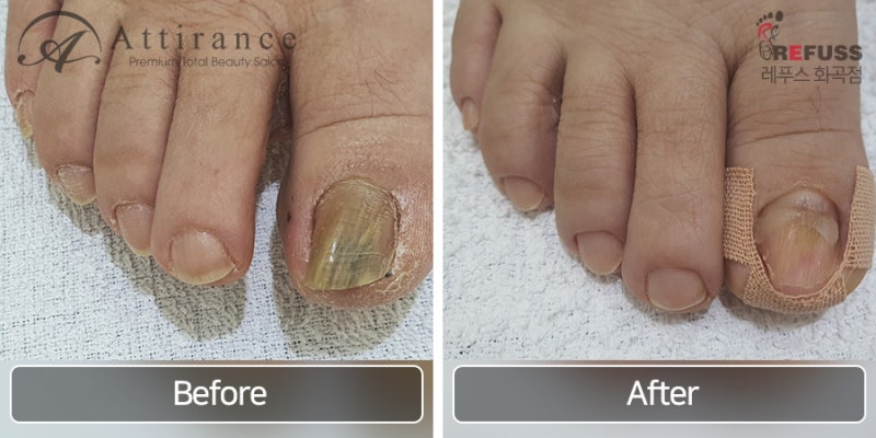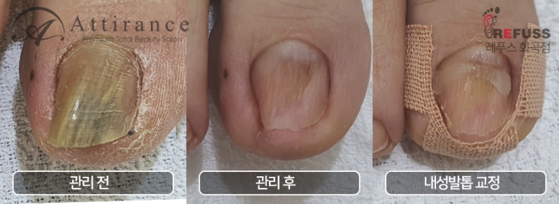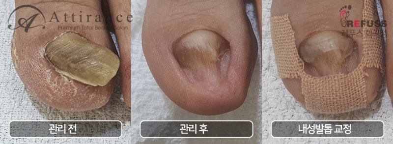 뽑는 것은 정상적인 발톱을 복원하지 않으며 더 복잡한 관리가 필요합니다. 이 변형된 발톱은 피부를 압박하여 염증과 통증을 유발합니다. 두꺼운 발톱을 제거해주세요. 더 필요하시면 완전히 나아질 때까지 4주마다 오십시오. 나중에 상황이 나아지면 6주와 8주마다 오십시오. 1차 진료 결과입니다. 1차 시술시 압점이 사라지기 때문에 1차 시술 후 통증이 모두 사라집니다. 최근에는 종종 스케일링이라고 합니다. 그냥 불러서 굵기를 빼면 시간이 지나면 말라서 내성발톱이 나오기 때문에 굵기를 조절한 후 필요하면 철사를 이용해서 말려있는 곡률을 잡아줍니다.
