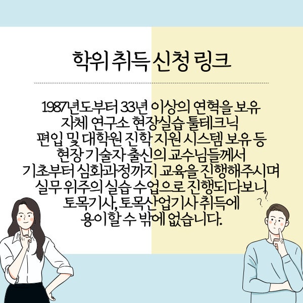 2. 토목기사 경력수첩 역량지수 역량지수는 개인의 4가지 지표를 측정하여 점수로 계산하는 것을 말합니다. 학력, 자격증, 경력, 협회교육으로 구분되며, 각각 획득할 수 있는 포인트가 다릅니다. 학력비전공 – 10점 관련 고졸 – 15점 관련 2년제 – 18점 관련 3년제 – 19점 관련 4년제 – 20점 기술자격 – 15점 산업기사 – 20점 엔지니어 /마스터 기술자 – 30점 기술자 – 40점 경력 1년 – 0점 2년 – 7.51점 3년 – 11.91점 4년 – 15.03점. 40년 – 40점 협회 훈련 35시간 역량 강화 훈련 – 2점을 제외한 모든 훈련 – 최대 1점 및 5점 토목 기사 자격증을 준비하는 경우 최소 중급에서 고급 수준. 당신은 그것에 대해 생각해야합니다. 또한, 단순히 인덱스를 보유하는 것이 아니라 모든 인덱스를 획득해야 합니다. 이 중 수첩에서의 빠른 승진을 위해서는 관련 학력의 유무가 중요합니다. 경험이 없더라도 학력지수+국가자격에서 얻은 점수를 활용하면 더 빠른 점수를 얻을 수 있습니다. 3. 토목기술자의 학력은 어떻게 되나요? 학력의 경우 대학 학력은 인정되나 대학 진학과 높은 등록금이 부담스러울 수 있습니다. 하지만 온라인으로 학위를 취득할 수 있는 평생교육제도 덕분에 이런 부담을 덜고 학위를 취득할 수 있습니다. 고등학교 졸업자라면 누구나 별도로 신청할 수 있습니다. 입학금이나 시험 없이 각 전공별 수업을 이수하고 학위를 취득할 수도 있습니다. 모든 강좌는 온라인으로 진행되므로, 별도의 출석 없이 주 14일 동안 모든 강좌를 수강하시면 출석으로 인정되어 해당 강좌를 모두 수강하실 수 있습니다. 등록금은 일반 대학의 1/4 수준으로 경제적입니다. 직장인이라도 어려움 없이 관련 수업을 들을 수 있고, 시스템 내에서 전문가의 도움을 받을 수 있다는 것이 장점이다. 4. 학력 취득 기간 일반적인 2년제 또는 4년제 학위를 취득하려면 동등 이상의 시간이 필요합니다. 그러나 평생교육제도는 수업 외에 추가적인 이수제도가 있기 때문에 개인의 상황에 따라 효율적인 방법을 활용하면 효과적으로 기간을 단축할 수 있다. 학점을 대체하는 자격증을 취득하거나 별도의 전공을 공부하세요. 시험에 합격하거나 이전에 다녔던 학교의 수업을 시스템에 연결하여 교과목으로 인정받을 수 있습니다. 이 경우 고졸이라도 2년 반이면 4년제 학위를 취득할 수 있다. 물론, 시스템 내에서 그 과정을 도와줄 별도의 행정 부서는 없습니다. 혼자 진행하기 어려울 수도 있지만, 그 과정 전반에 걸쳐 도움을 줄 전문 멘토가 있다면 어려움 없이 완료할 수 있습니다. 5. 토목기술자의 효율적인 준비기간 지금까지 토목기술자 준비 과정에 필요한 방법을 살펴보았다. 학위만 필요한 것은 아닙니다. 자격증+경력이 필요하기 때문에 쉽다고는 할 수 없는 과정이지만, 목표 달성 시 얻을 수 있는 더 좋은 대우+연봉+수첩 등 분명한 장점이 있습니다. 또한, 학력은 물론, 노트 발급 및 대행 과정까지 알려드리며 꼭 필요한 도움을 주시는 멘토님과 1:1 멘토링을 통해 꼭 필요한 강좌를 도와드릴 수 있도록 계획을 세워드립니다. 학위가 필요하신 분, 수업노트가 필요하신 분에게 딱 맞는 방법으로 필요한 방법을 가르쳐드립니다. 어디서부터 시작해야 할까요? 저널의 레벨을 높이고 싶다면 편리한 시간에 멘토와 상담하세요! 이전 이미지다음 이미지
