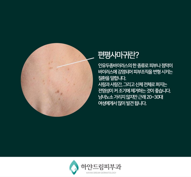 편평사마귀는 이름에서 알 수 있듯이 인유두종바이러스(HPV)에 감염되어 발생하는 사마귀 종류에 속하며 표면이 고르지 않고 갈색 또는 살색이며 직경이 5미터 미만입니다. 얼굴의 특징은 목에서 목으로 퍼지는 것인데 면역력이 낮아서 재발하기 쉽고 번지기 쉬우므로 조기치료가 매우 중요합니다.사마귀 레이저 치료