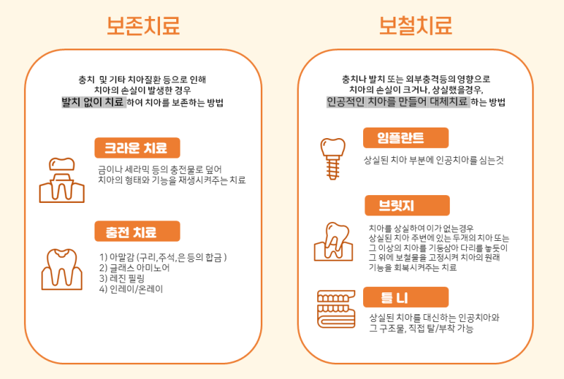 일단 치료가 시작되면 생각보다 비용이 많이 들 수 있고, 한번의 치료로는 부족하기 때문에 치과 치료를 부담스러워 하시는 분들이 많습니다. 시작하지 않으면 한 번의 치료로 많은 비용이 들 수 있는 흔한 치과 질환입니다. 하지만 많은 분들이 치료비 부담 때문에 적절한 치료 시기를 놓치고 계십니다. 관리를 위해서는 더 심해지기 전에 합리적인 치과보험에 조기에 가입하여 부담스럽게 느껴지는 치료비에 대한 심리적 부담을 줄일 수 있어야 합니다. 치과 치료에는 보존적 치료와 회복 치료가 있습니다.